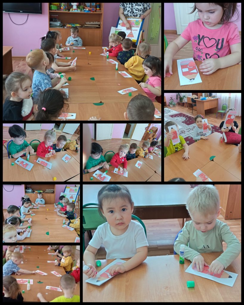 Кішкентайлар тобында көркем-шығармашылық іс-әрекет бойынша — аппликация сабағы өткізілді. Балалар дайын геометриялық пішіндерді жапсыру тапсырмасын үлкен қызығушылықпен орындап, олардан қарапайым бейнелер құрастырды.