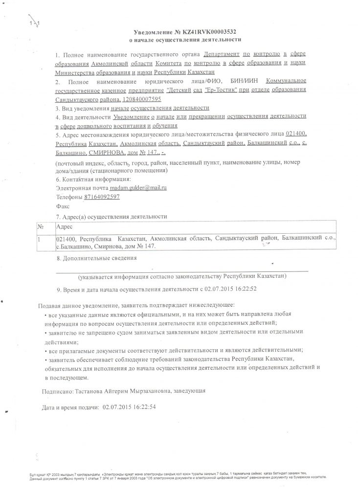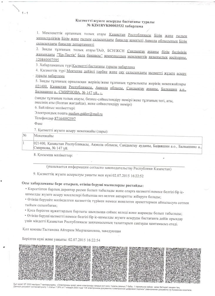 Государственное коммунальное казённое предприятие "Ясли-сад "Ер - Тостик"  села Балкашино при отделе образования по Сандыктаускому району управления образования Акмолинской области