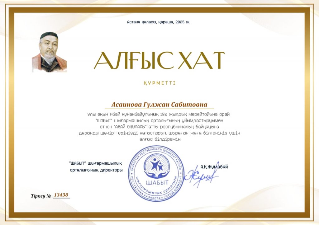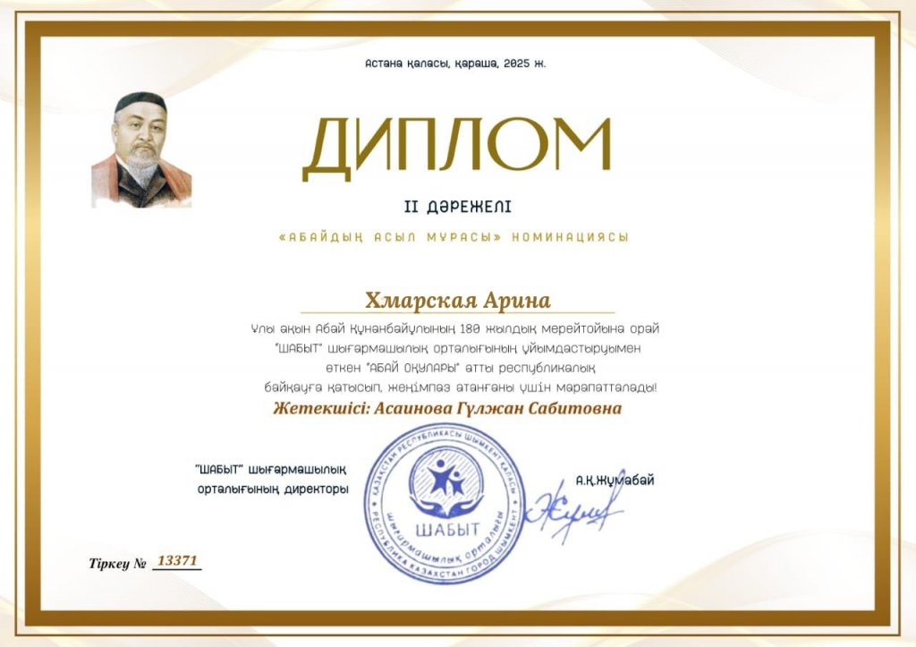 Қазақтың ұлы ақыны Абай Құнанбаевтың 180 жылдығына орай орта және даярлық тобының балалары "Абай оқулары" республикалық байқауына қатысып "Абайдың асыл мұрасы" номинациясында