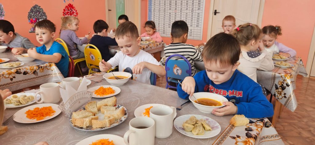 Бөбекжайымызда түскі ас мәзірі әртүрлі және балаларға пайдалы. Оған негізгі ыстық бірінші тағам, гарнир, салат және сусын - компот немесе кисель кіреді. Тағам әр баланың жасына сәйкес дайындалады және оларға белсенді күн үшін қажетті витаминдер мен энергия алуға көмектеседі