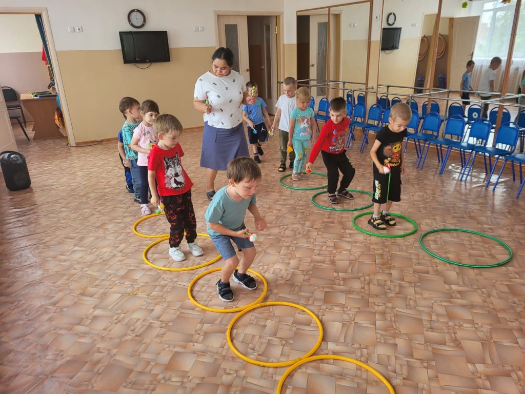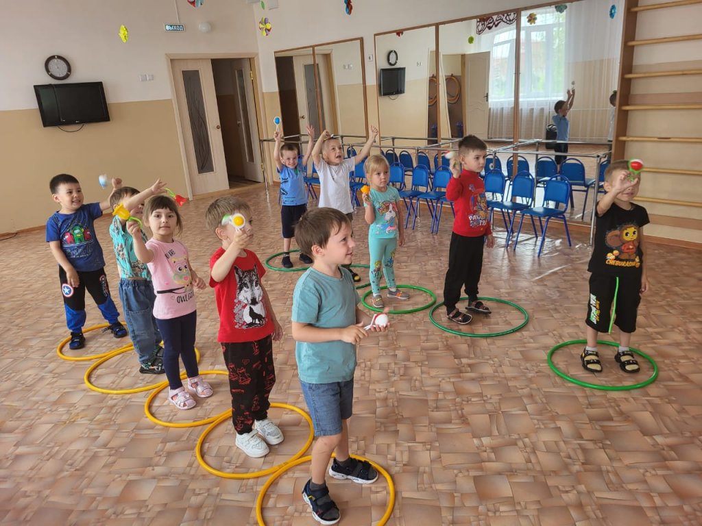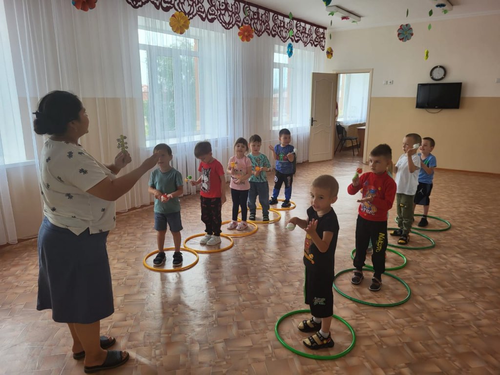 Ересектер тобымен шуылдақ аспаптармен жаттығулар жасау. Балалардың ырғағымен, дұрыс қимылдауын дамыту.