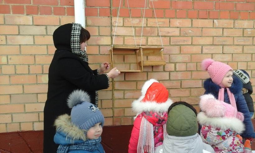 беседе, задавали вопросы, и угадывали загадки. Проведена была работа с картинками, и дети называли зимующих и перелетных птиц. Во время прогулки дети насыпали в кормушки хлебные крошки, крупы. Дети осознали что без помощи людей, зимой птицам очень сложно.